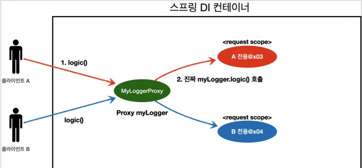 가짜 프록시 객체는 request 스코프의 진짜 logic()을 호출한다.