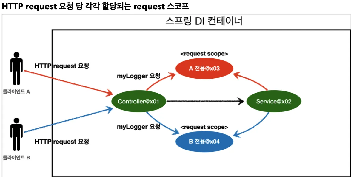 request : HTTP 요청 하나가 들어오고 나갈 때까지 유지되는 스코프