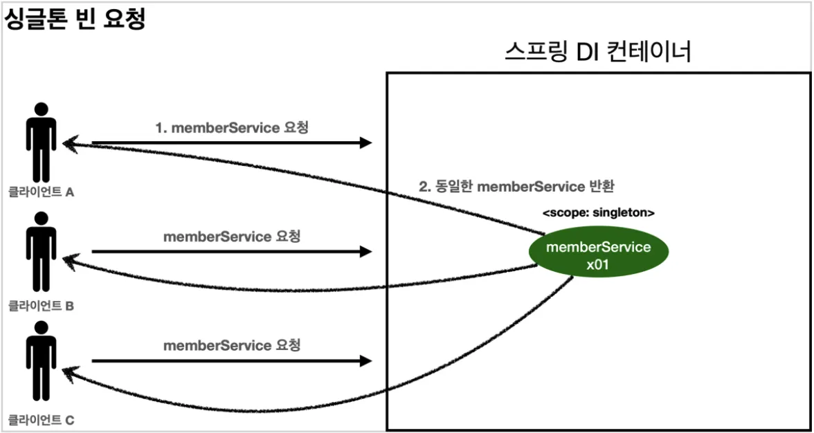 스프링이 해당 스코프의 종료시점까지 관리한다. 따라서 종료 메서드가 호출된다.