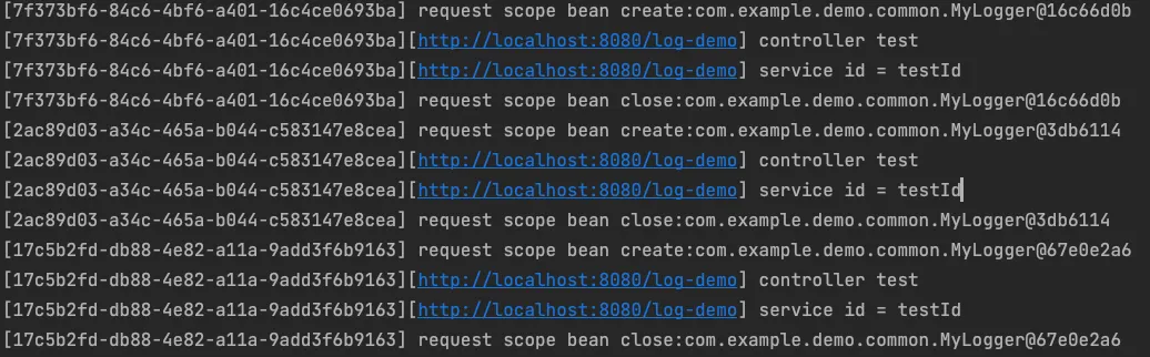 이제 결과를 보자 HTTP 요청이 생길 때마다 UUID를 독립적으로 만드는걸 확인할 수 있고