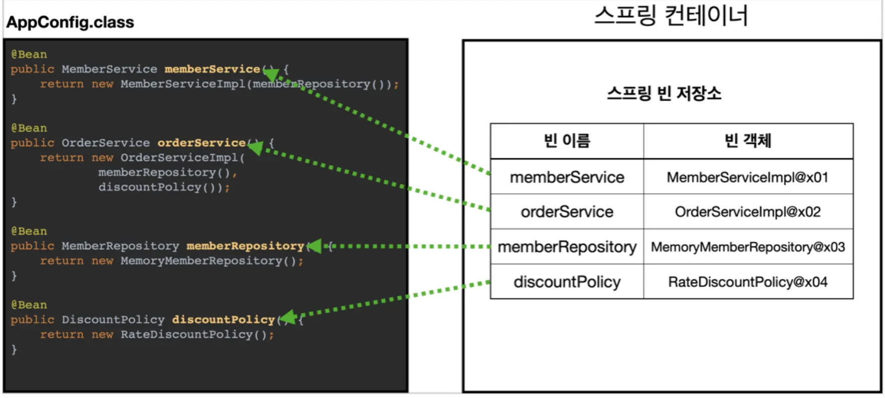 Configuration 내의 @Bean이 붙은 메서드를 모두 호출해 반환된 객체를 스프링 컨테이너에 등록한다