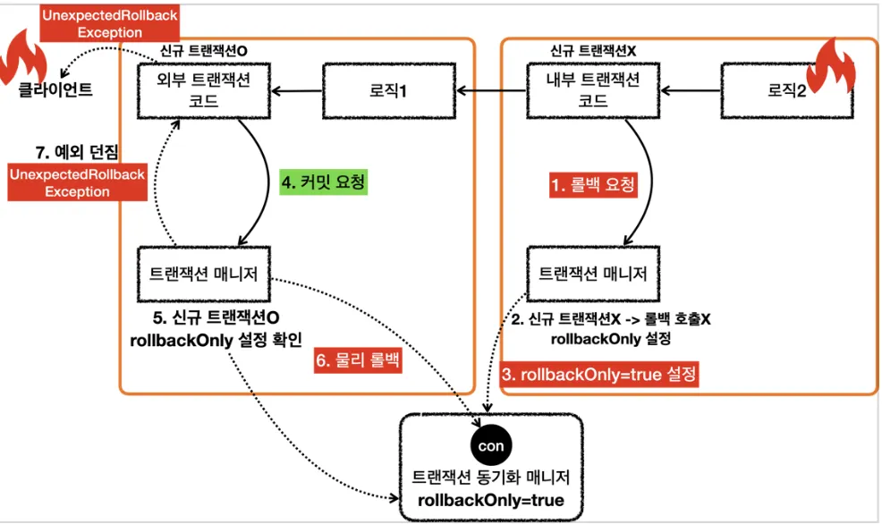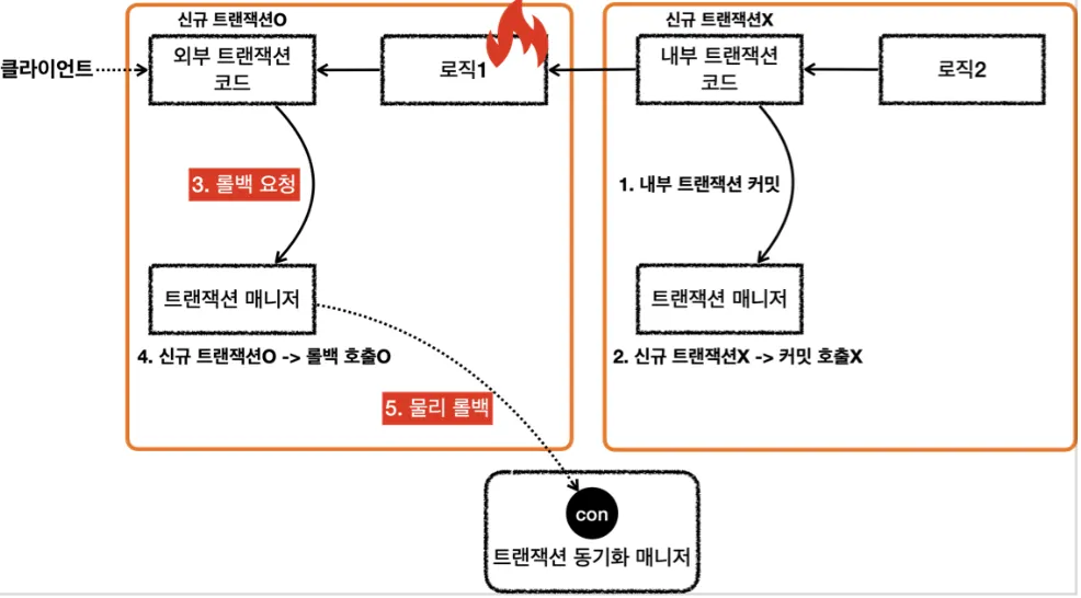 로직1이 끝나고 txManager를 통해 외부 트랜잭션 롤백 (실제 커넥션에 롤백 호출)