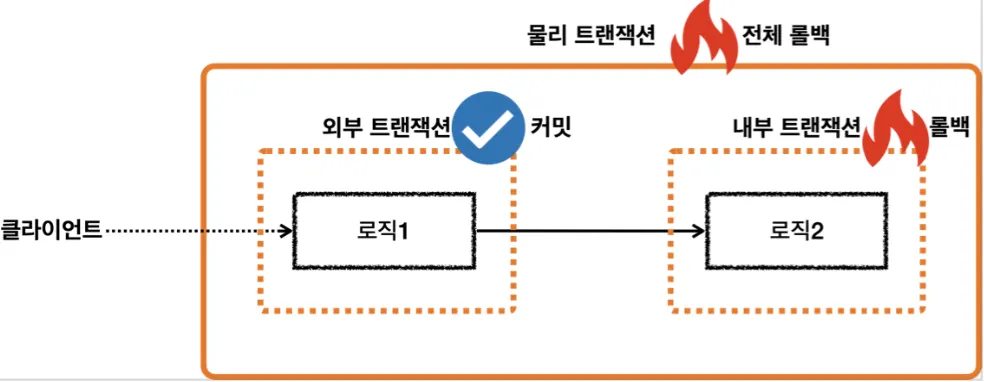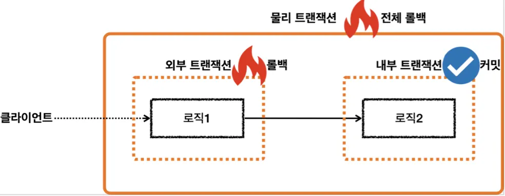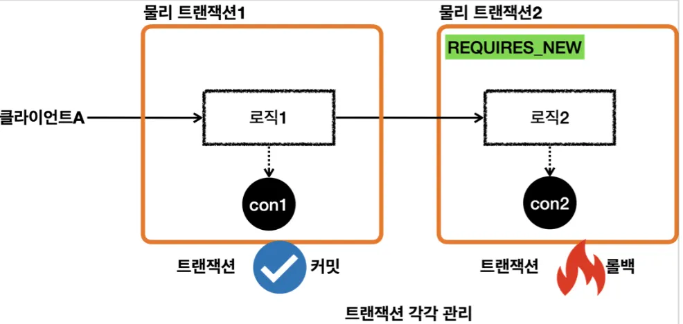 물리 트랜잭션을 분리하려면 내부 트랜잭션을 시작할 때 REQUIRES_NEW 옵션을 사용하면 된다.