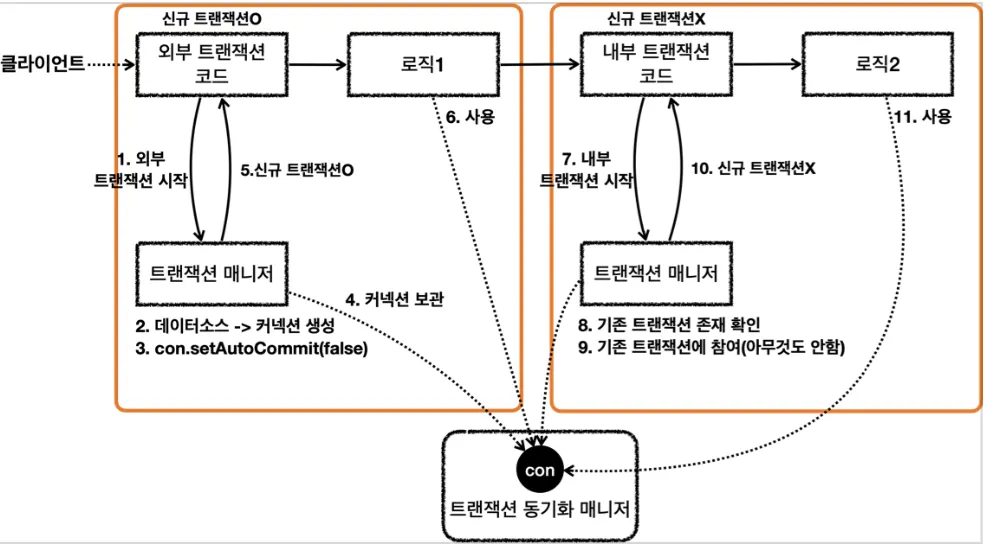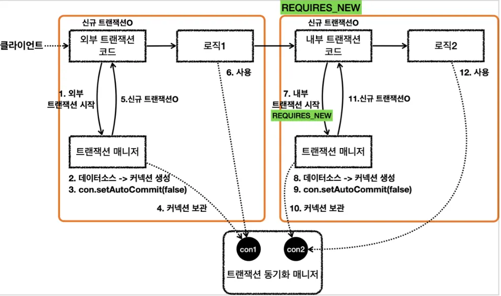 내부 트랜잭션이 실행되는 동안 외부 트랜잭션이 대기상태가 되기 때문에 데이터베이스 커넥션이 동시에 2개 사용되는 점을 주의해야 한다.