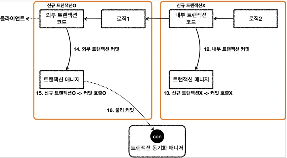 로직2가 끝나고 txManager를 통해 내부 트랜잭션 커밋 (실제 커넥션을 커밋하진 않음)