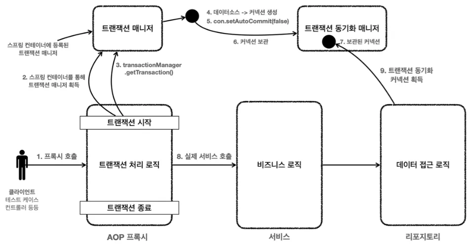 논리 트랜잭션은 트랜잭션 매니저를 통해 트랜잭션을 사용하는 단위이다.