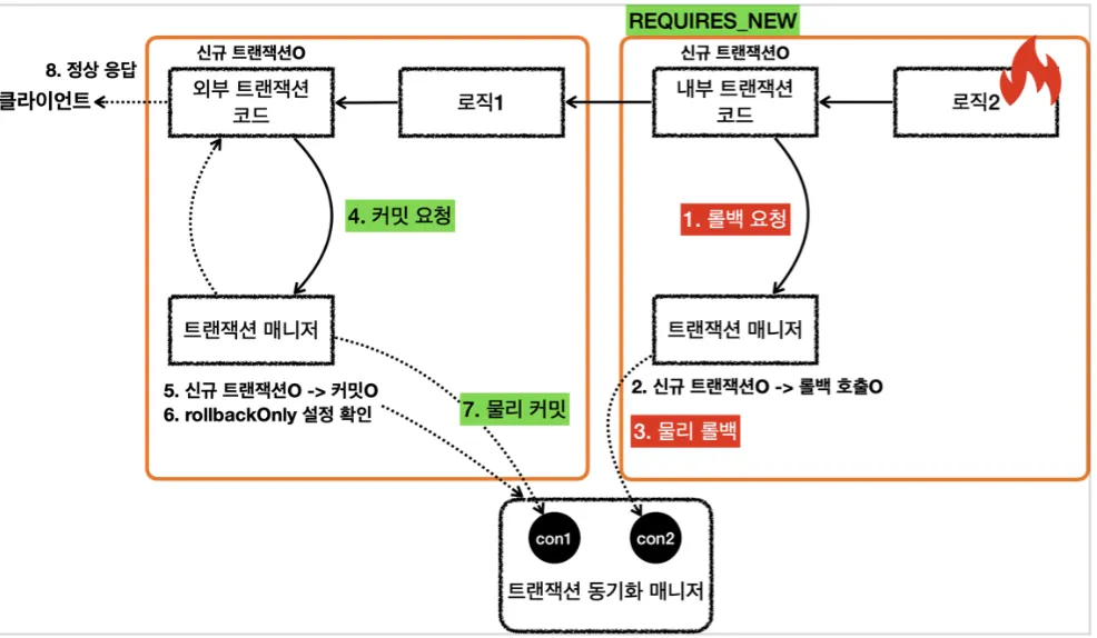 로직2가 끝나고 txManager를 통해 내부 트랜잭션 롤백 (실제 커넥션을 롤백하지 않음)