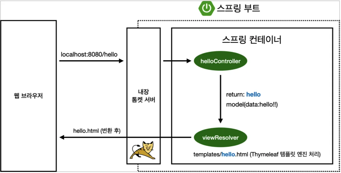 viewResolver는 html 이름에 해당하는 뷰를 찾고 thymeleaf 템플릿 엔진에 전달