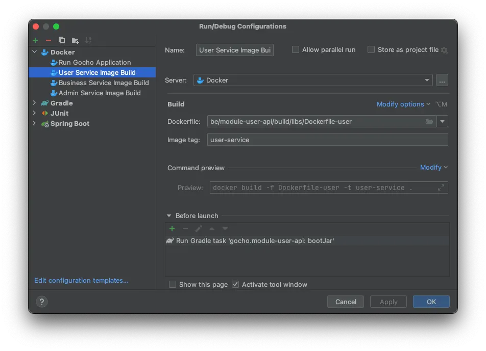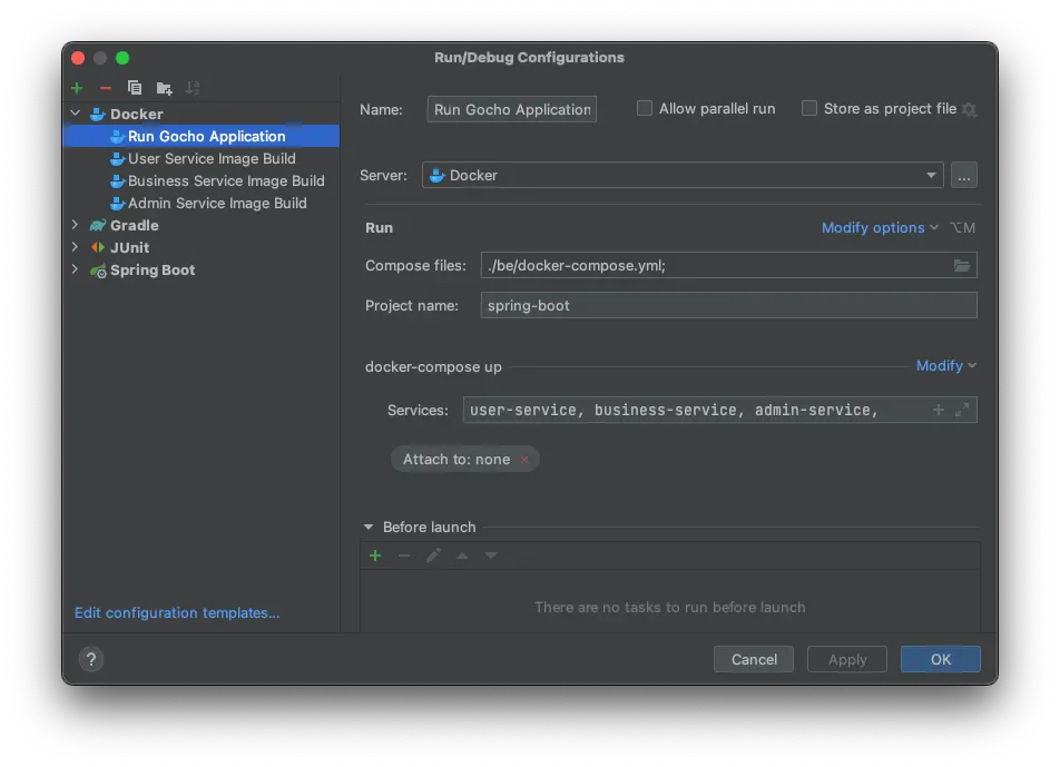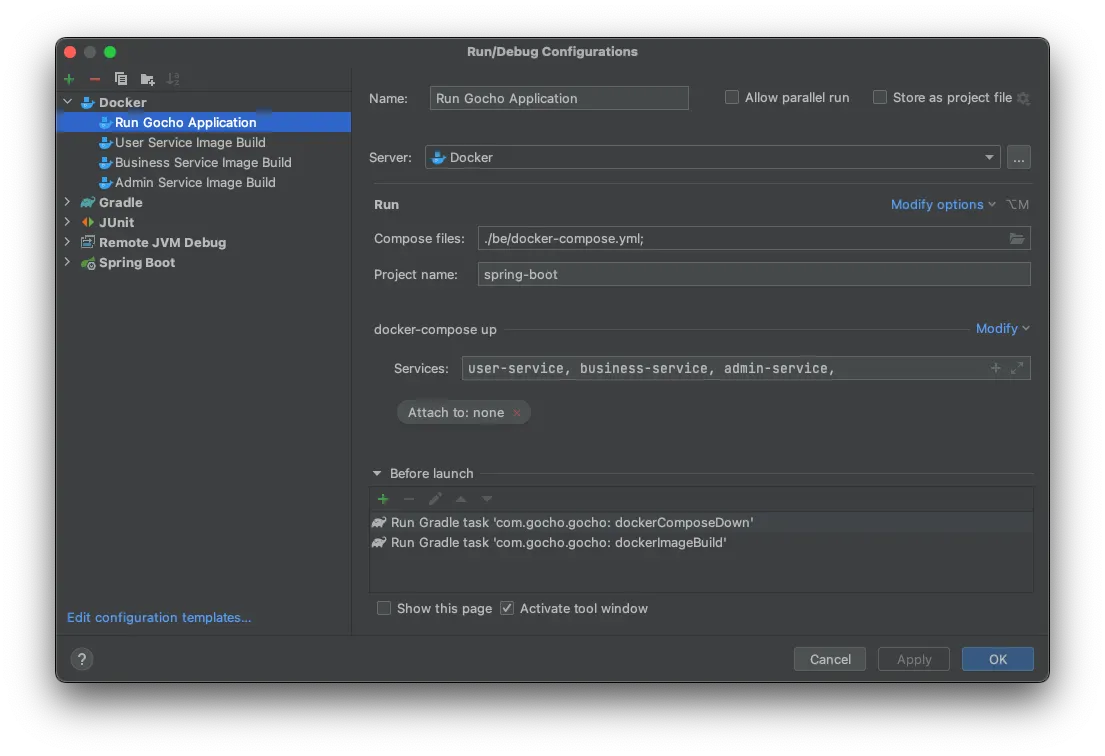 이 때 중요한 점은 Dockerfile에서 jar 파일을 COPY 해야하기 때문에 Before Launch로 Gradle의 bootJar Task를 선행해주어야 한다는 것입니다.