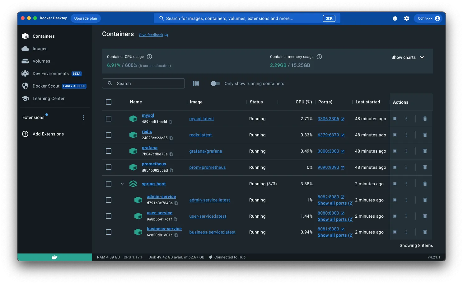 mysql, redis, prometheus, grafana 등의 컨테이너들은