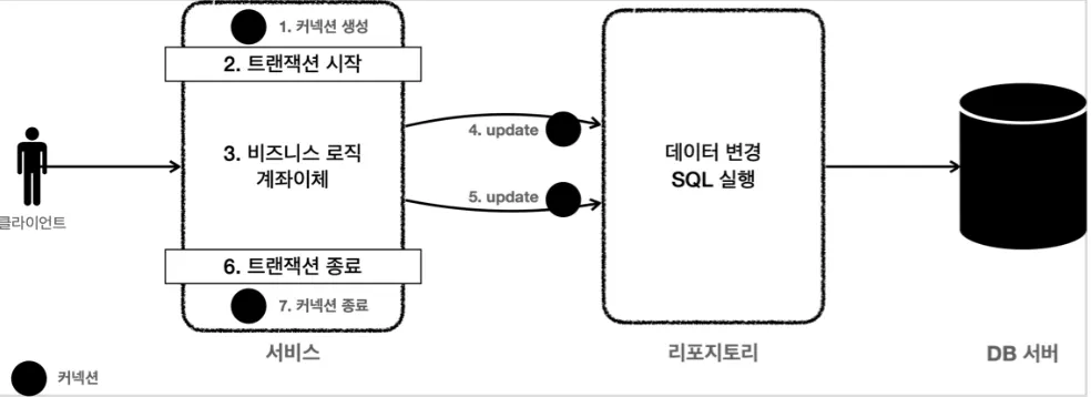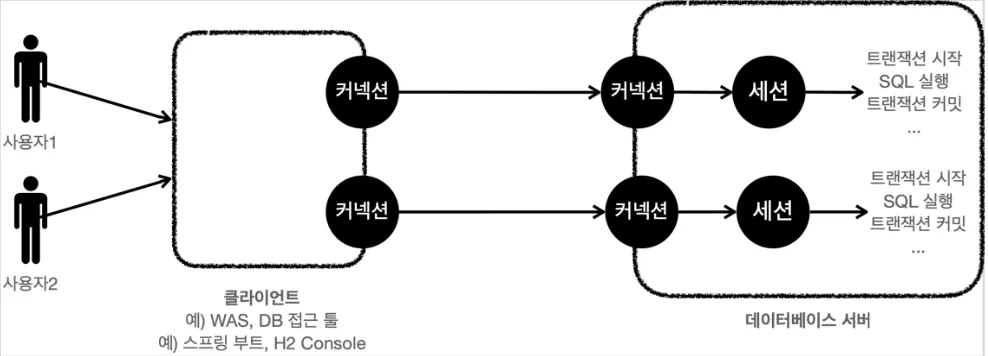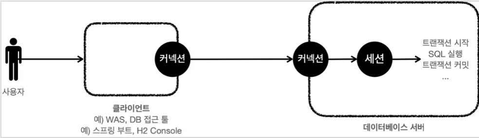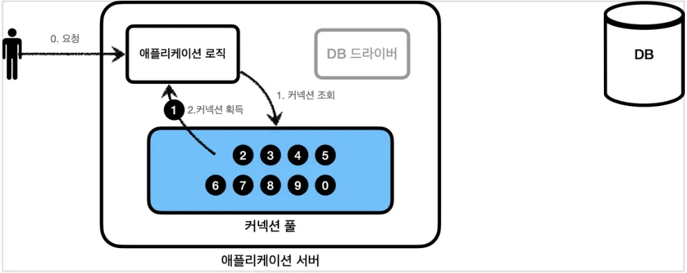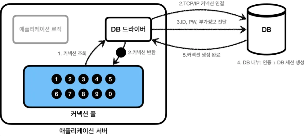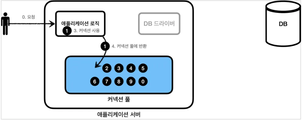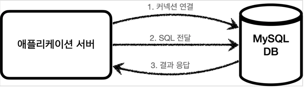 클라이언트가 애플리케이션 서버를 통해 데이터를 저장하거나 조회하면 애플리케이션 서버는 다음 과정을 통해서 데이터베이스를 사용한다.