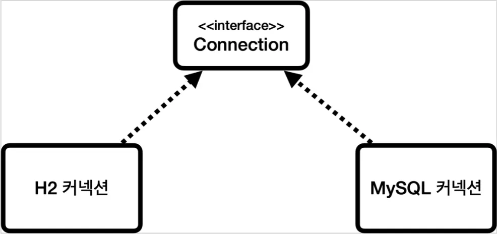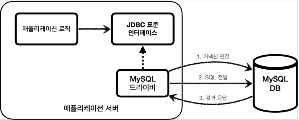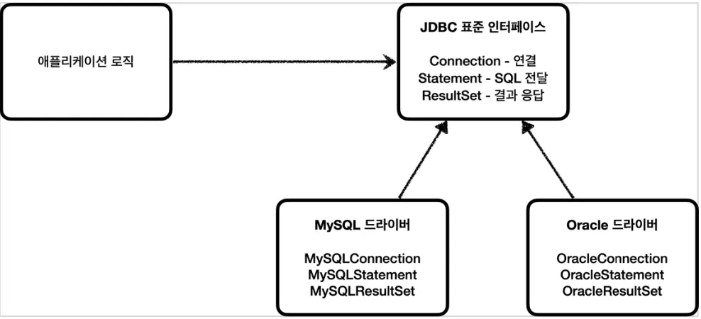 → 다른 종류로 변경하려면 애플리케이션 서버의 코드를 그대로 유지한 채 JDBC 구현 라이브러리만 변경하면 된다.