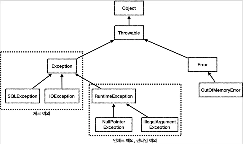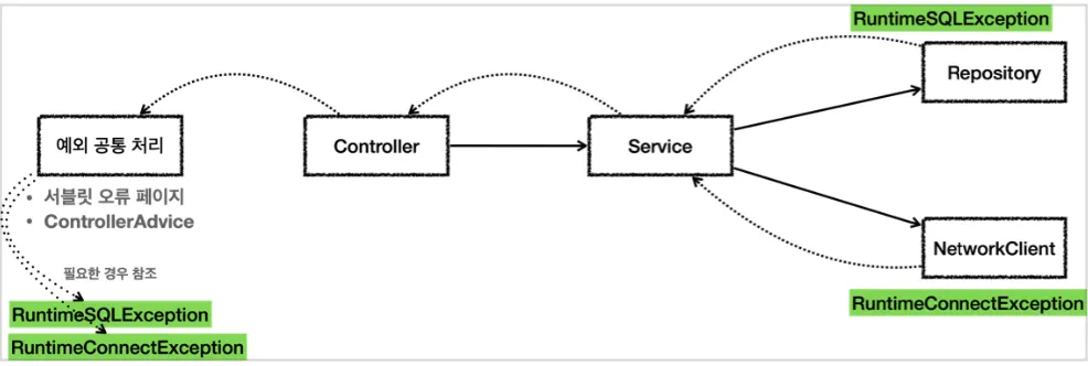 → 기본적으로 언체크 예외를 사용하고 체크 예외는 비즈니스 로직상 의도적으로 던질 때만 사용하자.