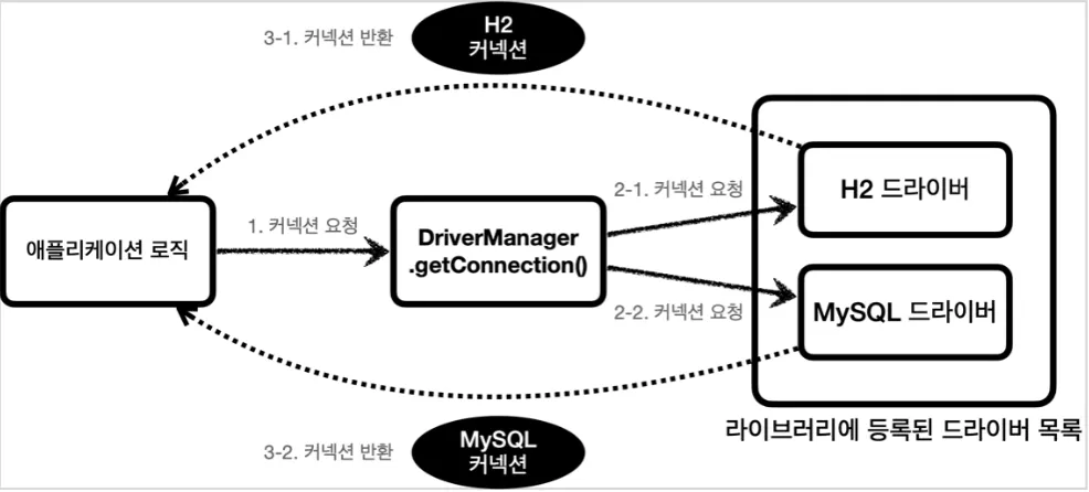 JDBC가 제공하는 DriveManager는 라이브러리에 등록된 DB 드라이버들을 관리하고 커넥션을 획득하는 기능을 제공한다.