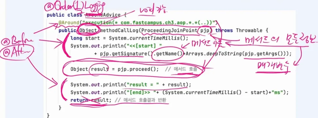 @Around(”execution(* com.fastcampus.ch3.aop.*.*(..))”)