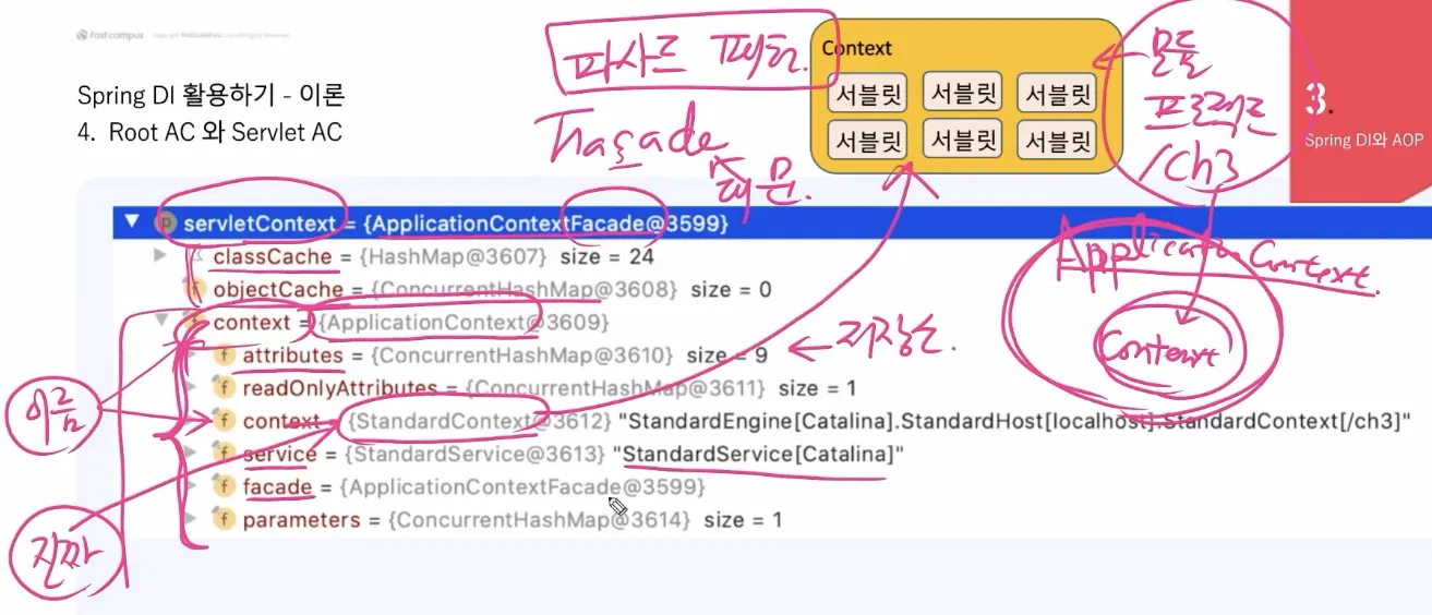 하위 ApplicationContext는 attributes + 서블릿들을 모은 context + 조상인 Service 등을 감싼 역할