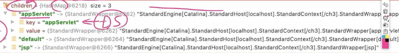 children : 각 서블릿들에 대한 정보(이름, 경로)를 갖는 저장소