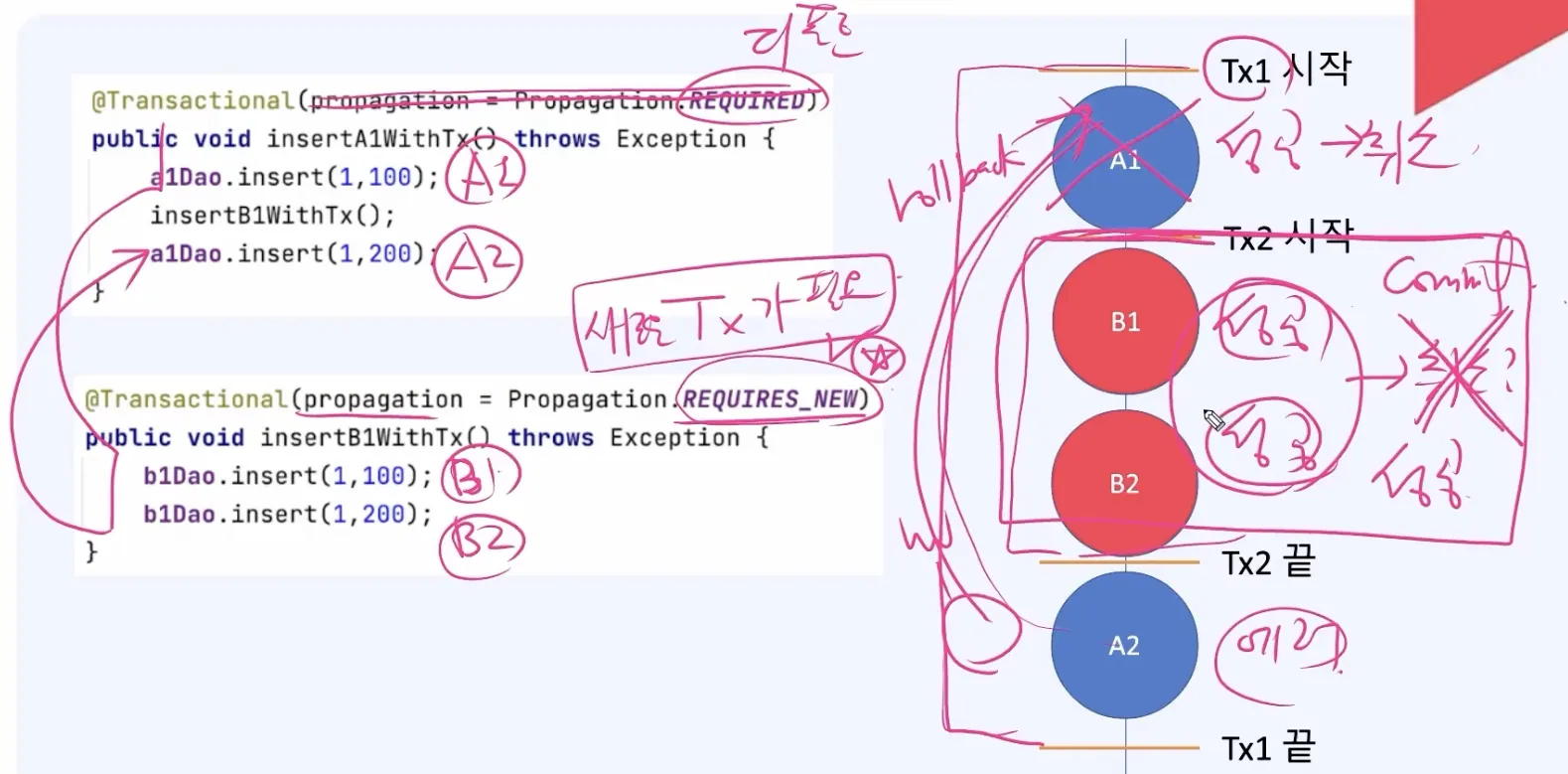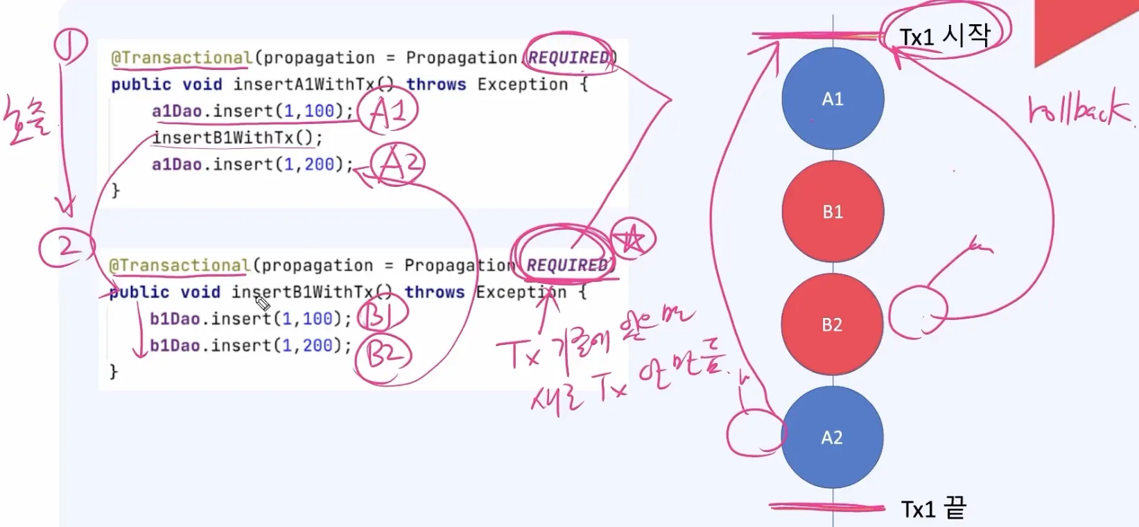 같은 클래스의 메서드를 호출하는 경우 Tx를 나눌 수 없으므로 클래스를 분리한 후 경계를 지정해야함