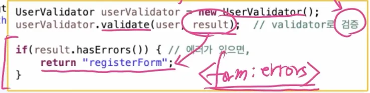 자동 검증 : @InitBinder 안에 setValidator 해준 뒤 검증할 필드 앞에 @Valid만 붙여주면 된다