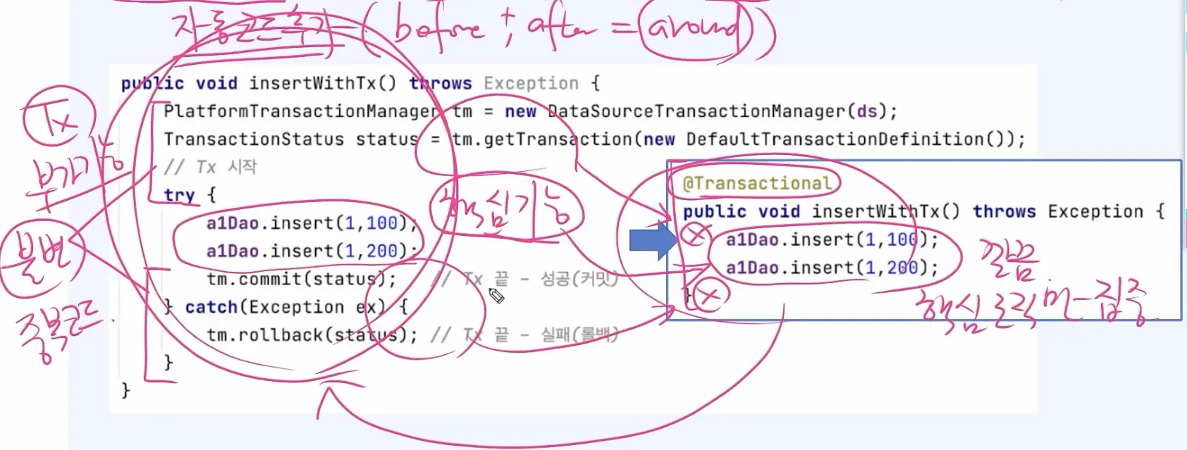 insert()라는 핵심 기능 위 아래로 붙은 부가 기능을 AOP를 통해 떼어낸 후 @Transactional을 사용
