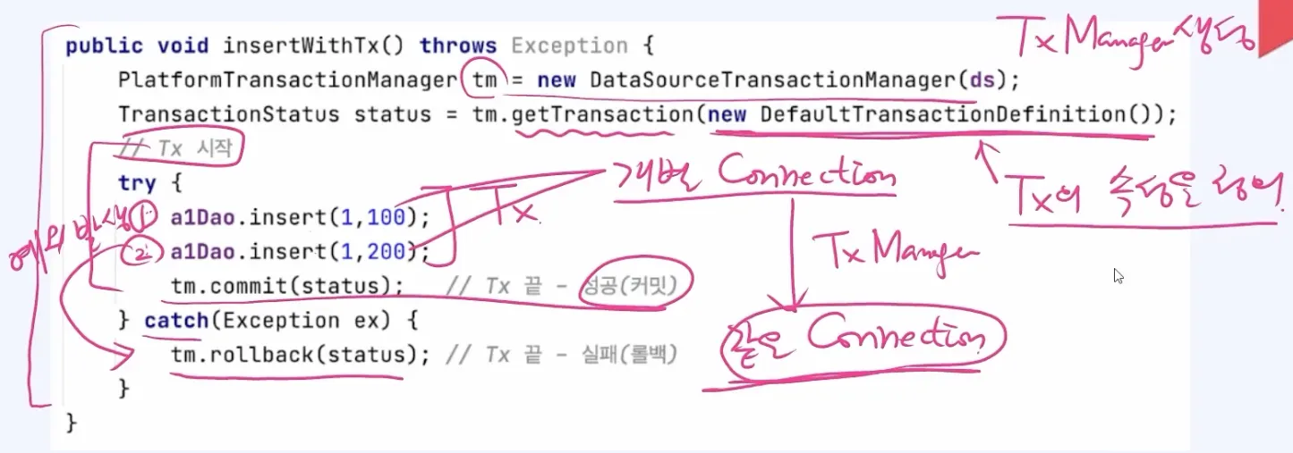 → 커밋과 롤백에 대한 문제를 해결하기 위해 TxManager를 사용해 Connection을 묶어줘야 한다