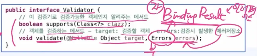 사용 예시 : Validator 인터페이스를 구현하고 supports, validate 추상 메서드를 구현한다